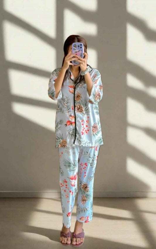 Flowers Printed Soft Cotton Night Suit ( PJ Set )